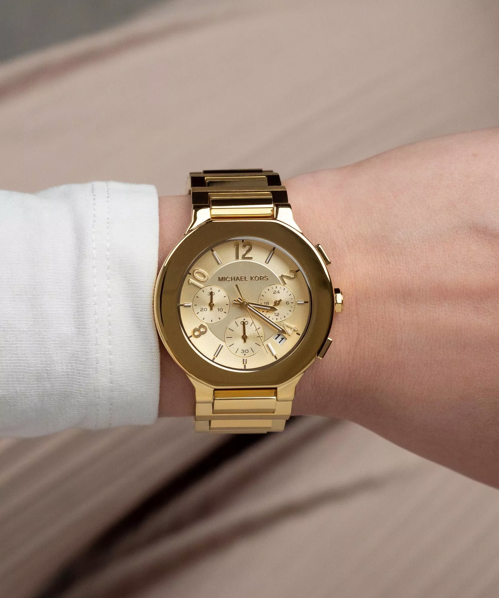 Ένα ρολόι με μοναδική φινέτσα, χρυσό καντράν, από επιχρυσωμένο ανοξείδωτο ατσάλι, με Χρονογράφο & ένδειξη Ημερομηνίας του οίκου Michael Kors.