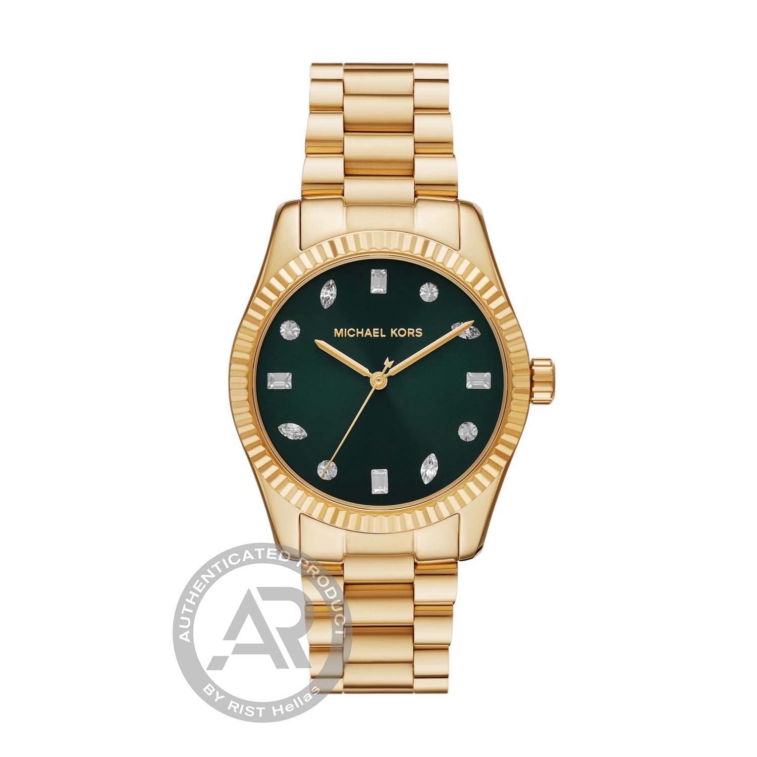 Από την αγαπημένη σειρά LEXINGTON ένα ρολόι με μοναδική φινέτσα, πράσινο καντράν, λευκά ζιργκόν στα σημεία στο εσωτερικό του και επιχρυσωμένο ανοξείδωτο ατσάλι,  του οίκου Michael Kors.