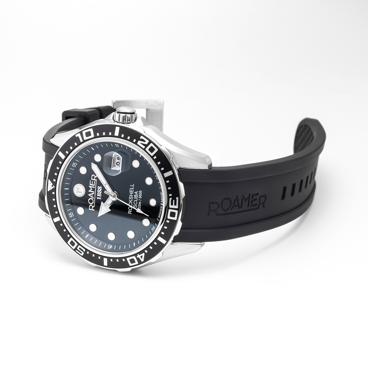 Ρολόι Roamer ROCKSHELL MARK III SCUBA με ελβετικό μηχανισμό, με πλαίσιο από ανοξείδωτο ατσάλι, με καντράν μαύρο και λουράκι σιλικόνης.